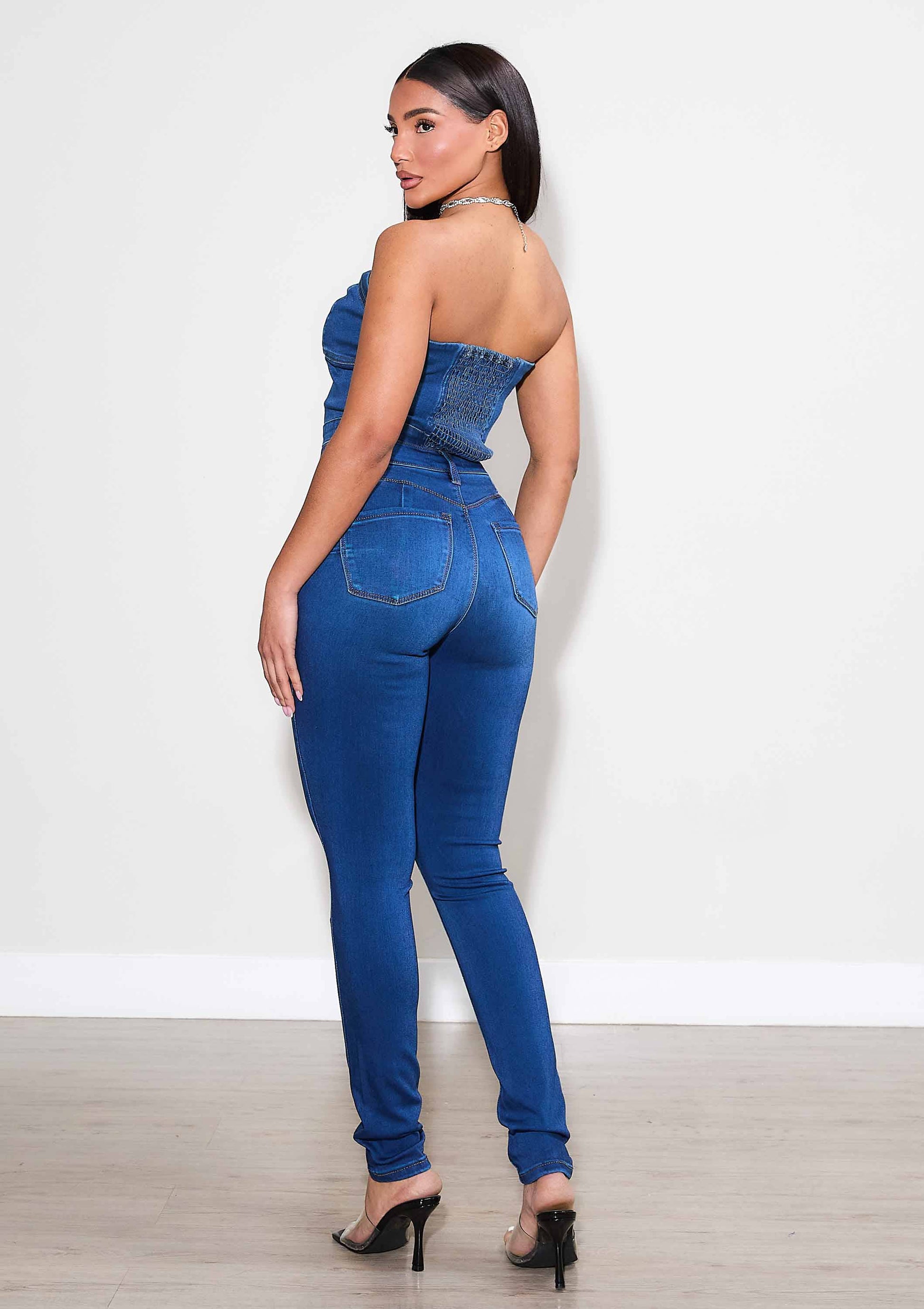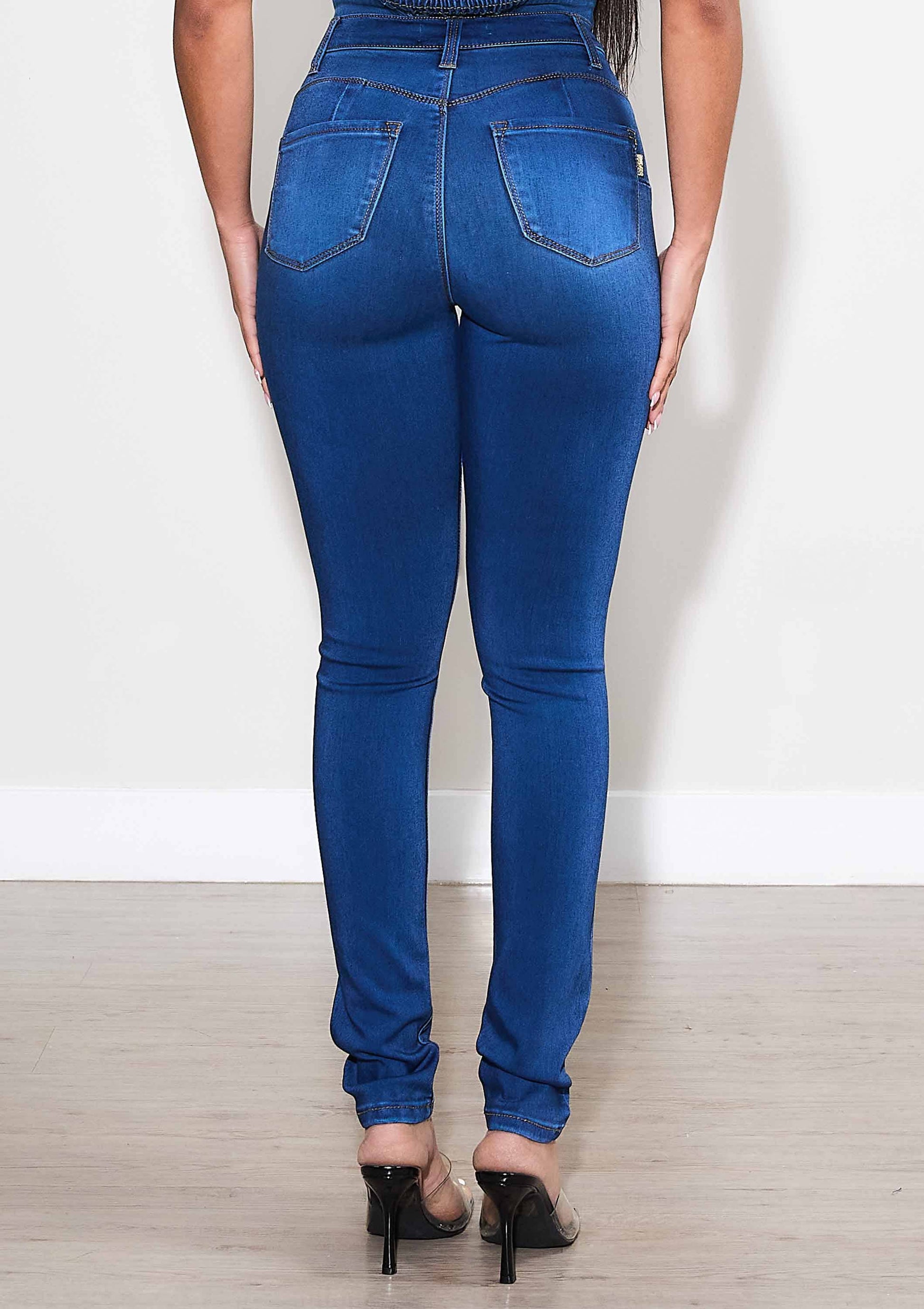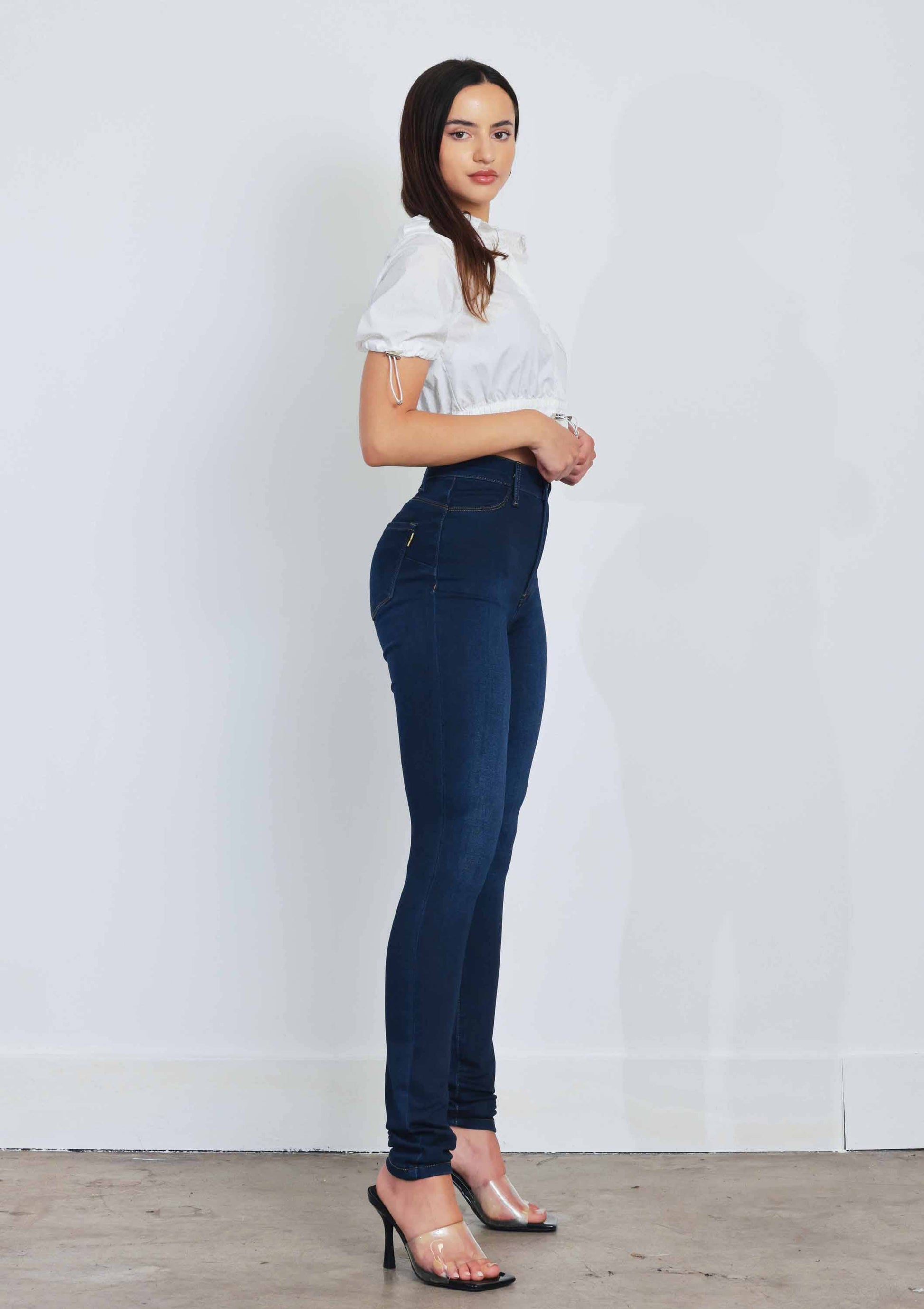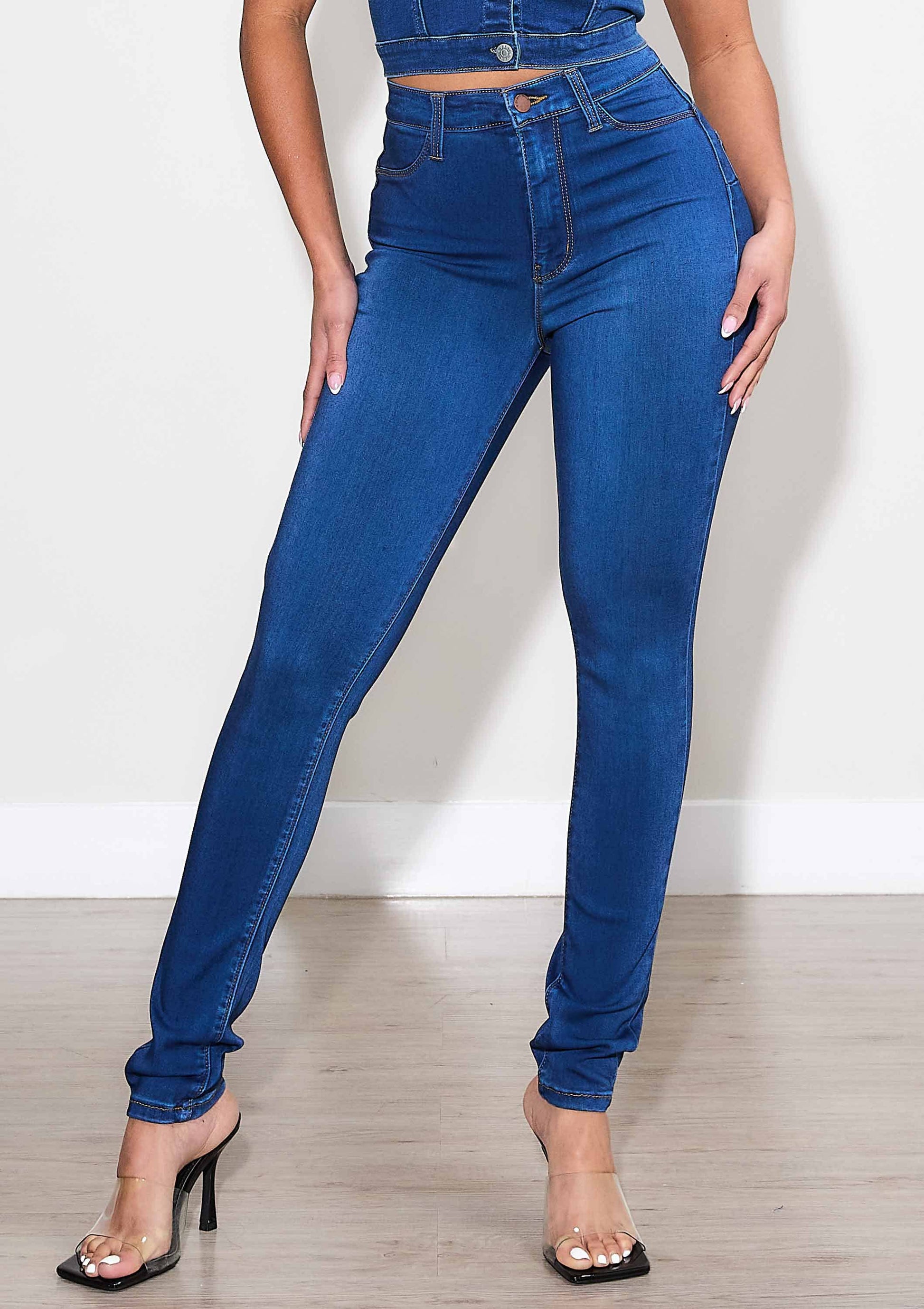 A pair of high rise skinny jeans featuring faux front pockets, two back pockets, and zip-fly closure. Soft and stretchy fabric gives cozy vibes, hugging all around body in a comfortble way.