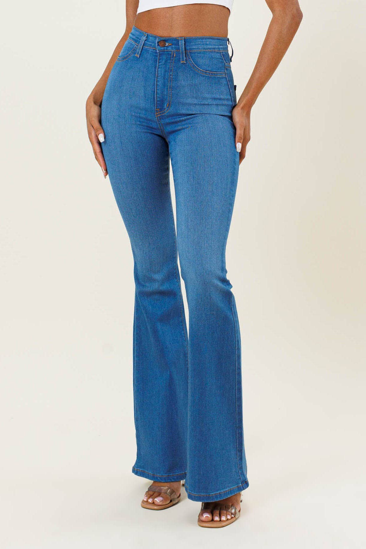 A pair of high-waisted flare jeans featuring faux front pockets, two back patch pockets and a zip-fly closure. Style this flare jeans with pair of cowboy boots for western apparel The latest in stretch technology, we've worked hard to provide you with the most comfortable, second skin worthy jeans made right here in Los Angeles!