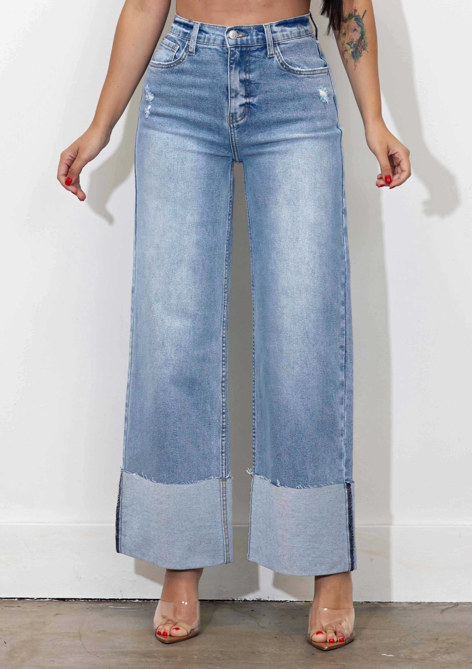 A pair of wide leg jeans featuring cuff up, subtle distress, classic 5-pocket construction and zip-fly closure.